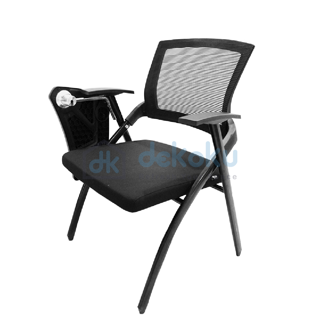 Spesfication: Sandaran dengan kain mesh, sehingga memberikan sirkulasi udara membuat punggung tidak lembab saat di guanakan, Hemat ruangan karena dapat disusun Horisontal, di lengkapi pegangan cup di bawah meja tulis.